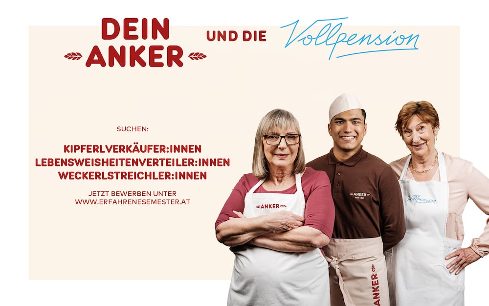 Eine Kooperation mit der Vollpension, dem Wiener Sozialunternehmen mit Expertise in der Integration von Seniorinnen und Seniorenin den Arbeitsmarkt, läuft bereits seit einiger Zeit. Jetzt startet die gemeinsame Initiative zur Beschäftigung von Pensionisten. Ziel dieser Partnerschaft ist es, möglichst viele pensionierte Senioren als Mitarbeiter für die Anker-Filialen zu gewinnen. Interessierte können sich über die speziell eingerichtete Plattform www.erfahrenesemester.at bewerben.