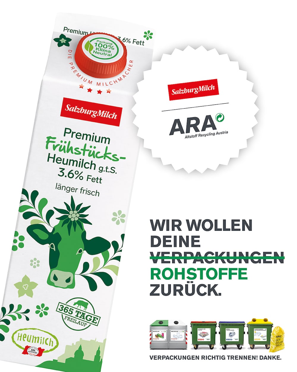 Die ARA konnte nun weitere Wirtschaftspartner gewinnen, um sich gemeinsam für die Kreislaufwirtschaft und den Umweltschutz in Österreich zusammenzuschließen. Unter anderem unterstützen Partner wie Ankerbrot, Maresi, Ölz, Rauch, die SalzburgMilch und noch viele mehr die Kampagne über ihre Kommunikationskanäle.