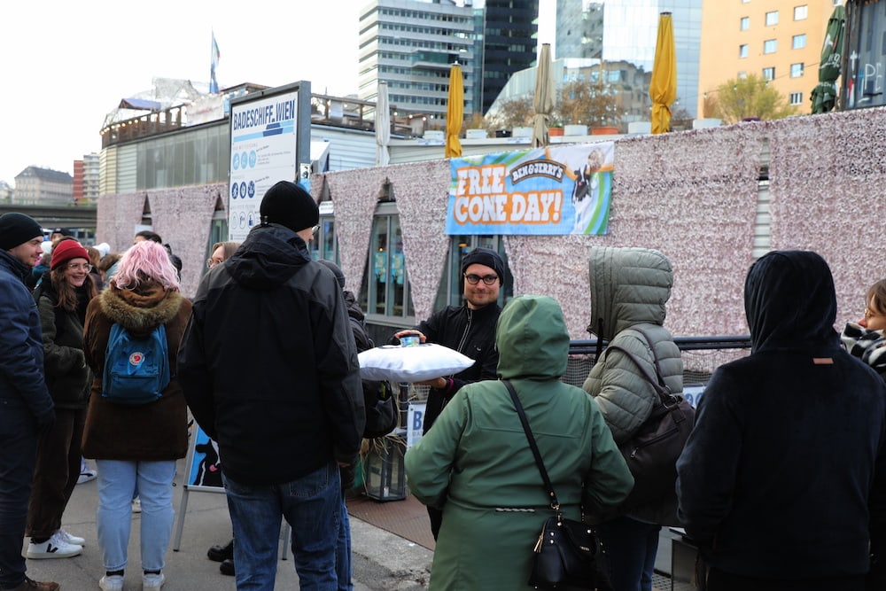 Es ist nie zu kalt für Ben & Jerry’s. Rund 800 Ben & Jerry’s Fans fanden sich am 3. April um 17 Uhr am Badeschiff Wien ein, um sich eines oder mehrere der 1.200 Gratisportionen Ben & Jerry’s abzuholen. Die Warteschlange reichte anfangs vom Badeschiff bis fast zur Urania zurück, die Fans warteten geduldig auf ihr Eis-Abendmahl. Und weil Ben & Jerry’s eine voll faire Marke ist, wurde auch dieses Jahr die solidarische Tradition gelebt: Das erste Eis bekam die letzte Wartende in der Schlange. Es wurde auf einem Peace-Kissen über die Köpfe der Wartenden bis zur letzten Ben & Jerry’s Fanin durchgereicht. Als die Glückliche das Eis in den Händen hielt, startete die Verteilung für die Ersten ganz vorn. Gratis zu verkosten gab es neben dem beliebten Klassiker Cookie Dough (auch als vegane Variante) auch den Peace Pop am Stiel und das ganz neue Dulce De-Lish. Pünktlich zum Start des Free Cone Day in Wien zeigte sich auch die Sonne und die Eisfans stellten sich teilweise mehrmals an.