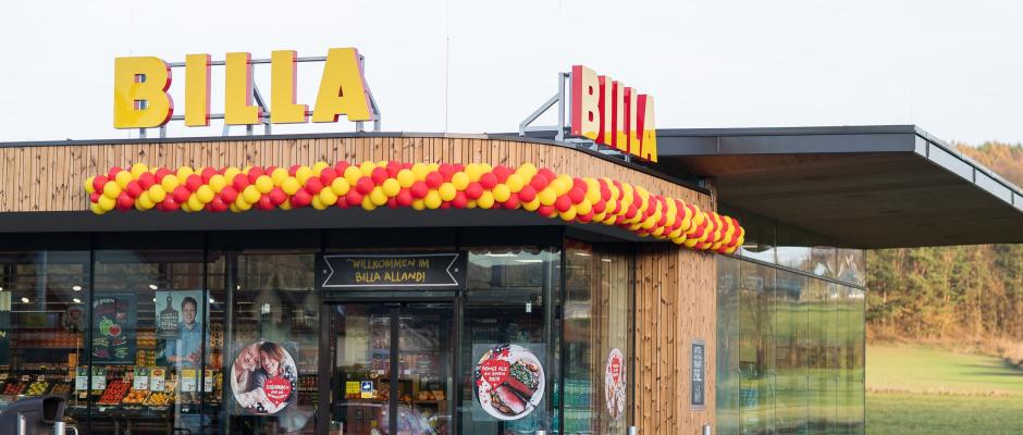 Auf 643 m2 entstand in Alland/NÖ nach zweimonatiger Bauzeit eine neue Billa-Filiale. Die Ladenoptik erinnert an Küche und Haushalt und vermittelt so einen hohen Wohlfühlfaktor. Es ist dies das neue POS-Konzept des Supermarktes. In der neu entwickelten Feinkostabteilung, aber auch in der Obst- und Gemüseabteilung kommen die neuen Elemente stark zum Tragen. „Unsere Kunden legen Wert auf frische Lebensmittel, die gesund sowie schnell und unkompliziert verfügbar sind. Daher präsentieren wir unsere Ready-to-eat-Produktpalette – darunter unter anderem Billa Freshy oder Simply Good – in der neuen Filiale besonders prominent“, so Billa Vorstand Robert Nagele. Klassische Haushaltselemente im Getränke-Bereich, die an die Vorratskammer zu Hause erinnern, sowie die Fenster-Optik im Kassabereich unterstreichen die häusliche Wohlfühlatmosphäre. Die neue Filiale erspart den Kunden außerdem den zusätzlichen Weg zur Post: Zu den regulären Filialöffnungszeiten und damit auch samstags können in Kooperation mit DHL Pakete abgeholt oder zurückgeben werden. Mit dem Billa Regional Regal führt die neue Filiale in Alland 40 Produkte von 25 Produzenten direkt aus der Region. 14 Mitarbeiter sind in Alland beschäftigt.