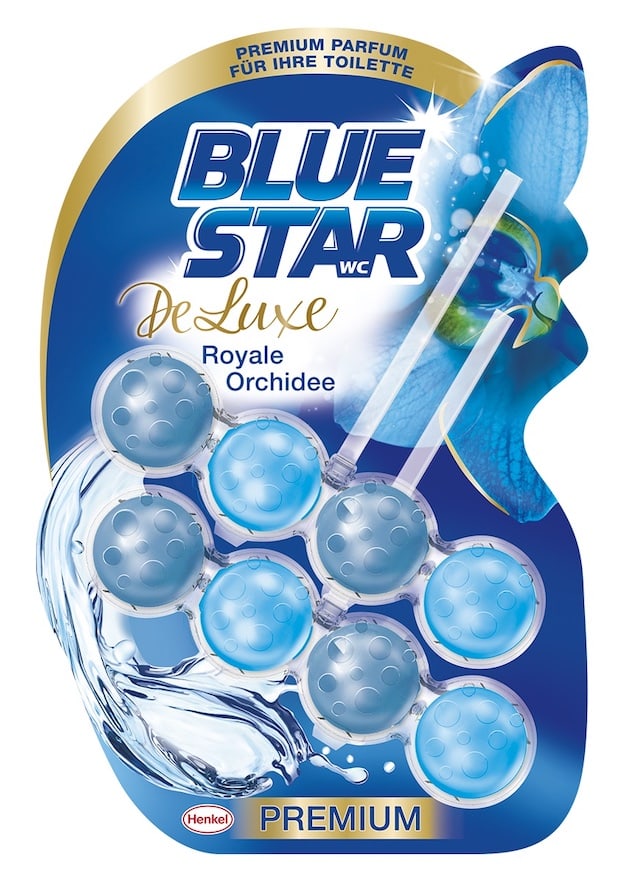 Mit der Premium-Linie DeLuxe bringt Blue Star raffinierte Duftkompositionen ins Badezimmer, die von Parfums inspiriert sind und ein luxuriöses Ambiente schaffen. Die neue Variante Blue Star DeLuxe Royale Orchidee wertet das WC mit dem eleganten Duft von Orchideen auf. Dabei arbeitet der WC-Stein mit der bewährten vierfachen Aktivstoff-Kombination: Neben landanhaltendem Duft bietet der 4-fach-Effekt eine langanhaltende Frische bis zur letzten Spülung. Die vier Kugeln von Blue Star DeLuxe werden bei jedem Spülvorgang aktiviert und der Schmutz-Protektor mit Anti-Kalk-Effekt verhindert effektiv, dass sich durch das Spülwasser unschöne Ablagerungen bilden. Gleichzeitig sorgt der Aktiv-Reinigungsschaum für strahlende Sauberkeit im WC.