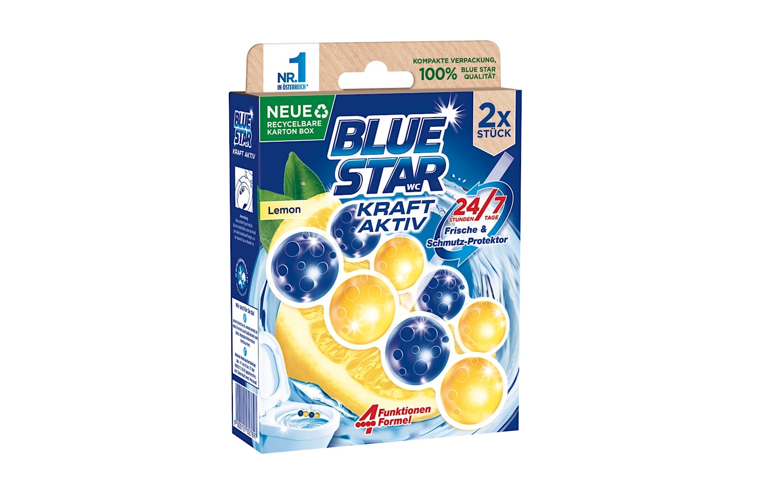 Henkel übernimmt einmal mehr Verantwortung in Sachen Umweltschutz und setzt mit einem neuen Packaging-Konzept bei Blue Star ein starkes Zeichen für mehr Nachhaltigkeit im Haushalt: Die bewährten Blue Star WC-Beckensteine werden anstelle der bisherigen Blister-Verpackung auf eine innovative Kartonverpackung umgestellt – vollständig recycelbar und dabei gleichzeitig wesentlich kompakter im Format. Die neue Verpackung enthält insgesamt 89% weniger Plastik als bisher.