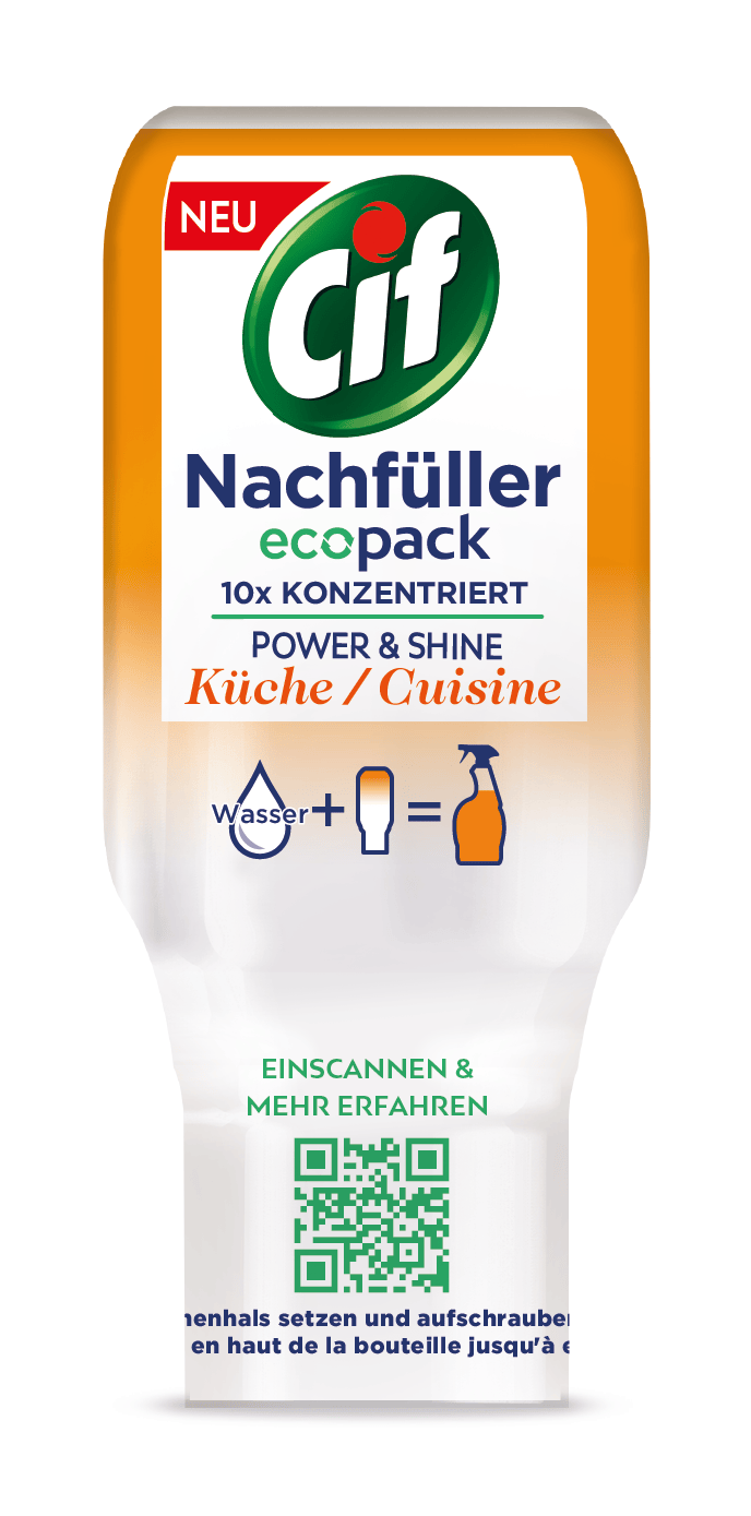 75 % weniger Kunststoff, 100 % recyclebar und, weil deutlich kleiner, auch platzsparender im Transport, was zu weniger LKW-Treibhausgasemissionen führt – der neue Cif Nachfüller ecopack ist vorbildlich in Sachen Nachhaltigkeit. Ist der Cif Power & Shine Küchenreiniger aufgebraucht, muss ab sofort keine neue Flasche mehr gekauft werden – der Reiniger wird einfach nachgefüllt. Und so einfach geht ́s: Zuerst die leere Flasche bis zur Markierung mit Wasser befüllen und dann die kleine Cif Nachfüll-Kapsel auf die Öffnung aufsetzen. Durch leichtes Drehen gelangt mit einem Klick das 10-fach Konzentrat in die Flasche. Mit dem Nachfüller kann die Spray-Flasche bis zu 15 Mal wiederverwendet werden.