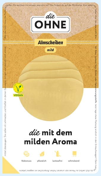Ohne Milch, ohne Laktose, ohne Gluten: Unter der beliebten Veggie-Marke die Ohne gibt es neben Wurst- und Fleischersatzprodukten jetzt auch vegane Almscheiben. Die Rezeptur basiert auf Kokosfett, Johannisbrotkeimmehl sowie Gewürzen und überzeugt mit authentischem Geschmack und zartem Schmelz. Die veganen Almscheiben gibt es in den Sorten mild und würzig und sie passen perfekt zu frischem Brot, Sandwiches oder Toasts. Sie eigen sich aber ebenso gut zum Überbacken von Gemüse, als Pizzabelag oder zum Kochen von Eintöpfen und Suppen (z.B. vegane Käsesuppe).