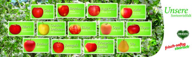 Der frisch-saftig-steirisch Apfel kann in zwölf ganz unterschiedlichen Sorten genossen werden – vom süß-saftigen Gala und Golden Delicious, über den fein-würzigen Kronprinz Rudolf, Braeburn und Topaz bis hin zum mild-säuerlichen Idared ist für jeden Geschmack der richtige Apfel dabei. Eine Besonderheit ist die Clubsorte Evelina mit intensiver roter Schale und sehr knackigem, leicht säuerlichem Fruchtfleisch.