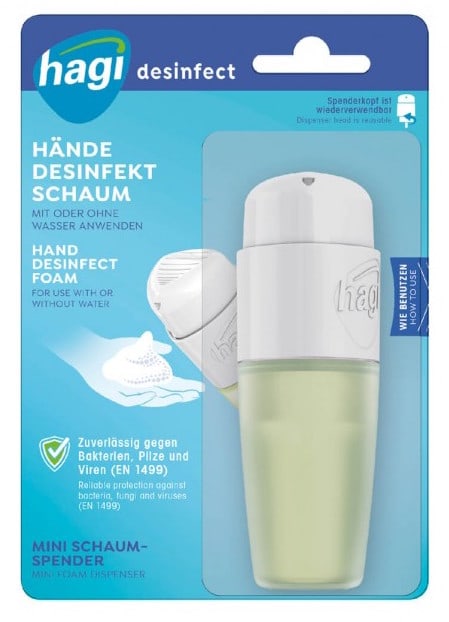 Sowohl der hagi desinfect Händedesinfekt Schaum, der mit oder ohne Wasser anwendbar ist, als auch der hagi desinfect Oberflächendesinfekt Schaum zum Reinigen von z.B. Einkaufswagen, Türklinken etc. sind begutachtet gegen Bakterien, Pilze und Viren und wirken nachweislich gegen das Corona-Virus SARS-CoV-2.