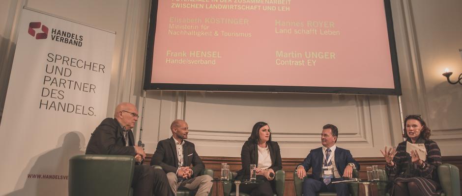 Die Ansichten müssen vielfältig betrachtet werden. Am Tag des Handels haben über die weitere Zusammenarbeit zwischen LH und Landwirtschaft diskutiert: Elisabeth Köstinger (Bundesministerin für Nachhaltigkeit und Tourismus), Frank Hensel (Vizepräsident Handelsverband), Hannes Royer (Land schafft Leben) und Martin Unger (Contrast EY).