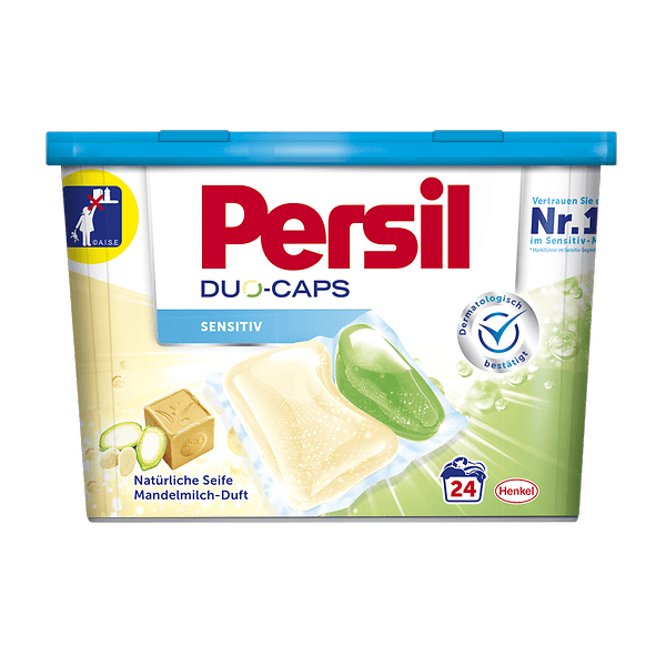 Die neuen Persil Duo-Caps Sensitiv verbinden die bewährte Persil-Qualität mit einfacher Anwendung und guter Hautverträglichkeit. Die vordosierten Gel-Kapseln kommen zusammen mit der Kleidung in die Waschtrommel und lösen sich dank der wasserlöslichen Folie beim Waschen vollständig auf. Damit wird einer Überdosierung des Waschmittels vorgebeugt und schon ab 20 Grad Wassertemperatur strahlende Reinheit garantiert. Gleichzeitig ist die mit Dermatologen entwickelte Formel mit natürlicher Seife und Mandelmilch besonders hautverträglich.