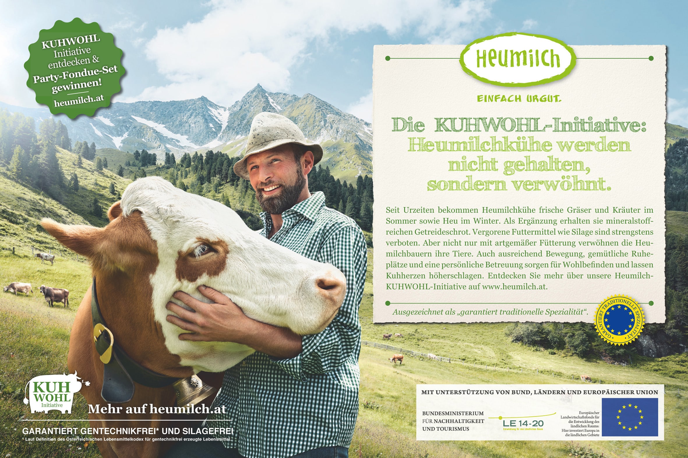 Die neue Kampagne verdeutlicht ab September: „Heumilchkühe werden nicht gehalten, sondern verwöhnt.“ Damit legt die ARGE Heumilch ihren Kommunikationsschwerpunkt diesen Herbst auf ihre Heumilch-Kuhwohl-Initiative. Mit über 800 TV-Spots werden rund 24 Millionen Kontakte und über 70 % der Zielgruppe erreicht. Zusätzlich sorgen eine Online-Kampagne sowie Inserate in zielgruppenspezifischen Medien für Aufmerksamkeit.
