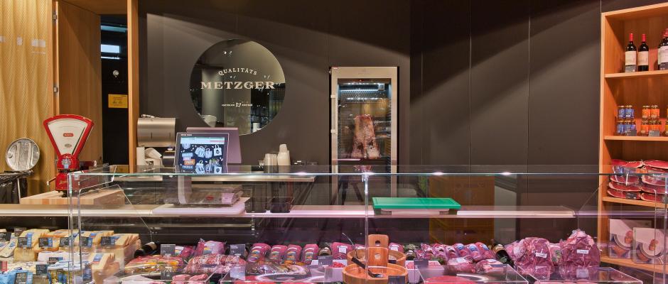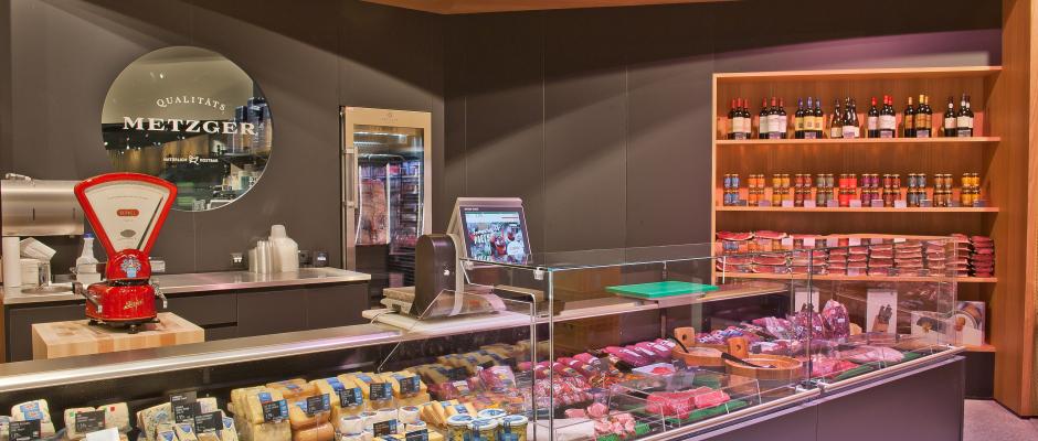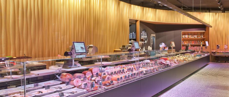 Die an sich nicht übergroße Fläche des Marktes wurde perspektivisch gekonnt in Szene gesetzt. Die leicht in die Diagonale versetzten Regalfluchten leiten den Blick zum Feinkostbereich am anderen Ende und vermitteln angenehme Weite und Freiraum. Der Raum wird von einem „Vorhang“ aus Gold umrahmt, der auch den Hintergrund zur Feinkosttheke mit Qualitätsmetzger bildet.