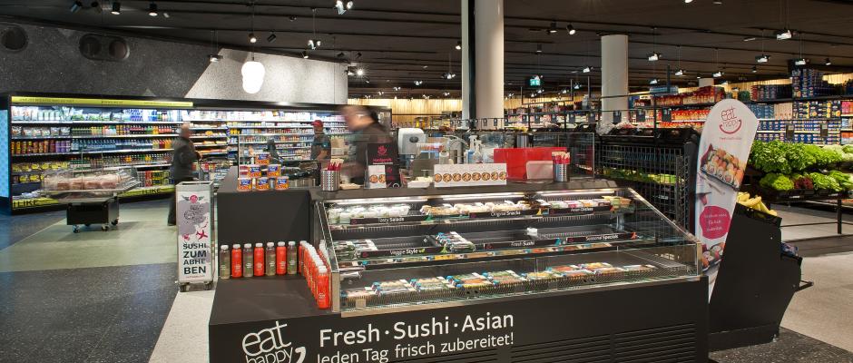 Vom Qualitätsmetzger über Lindt, einer Alnatura Welt, Eat Happy Shushi, einer italienischen Feinkostabteilung, die Qualitäts-Convenience Linie „I like“ aus dem Hause MPreis und der hauseigenen Bäckerei Baguette. Eine gewisse Ähnlichkeit erinnert an den MPreis im Kaufhaus Tirol, aber mit dem neuen Markt im DEZ ist nun ein neuer Flagship Store geboren.