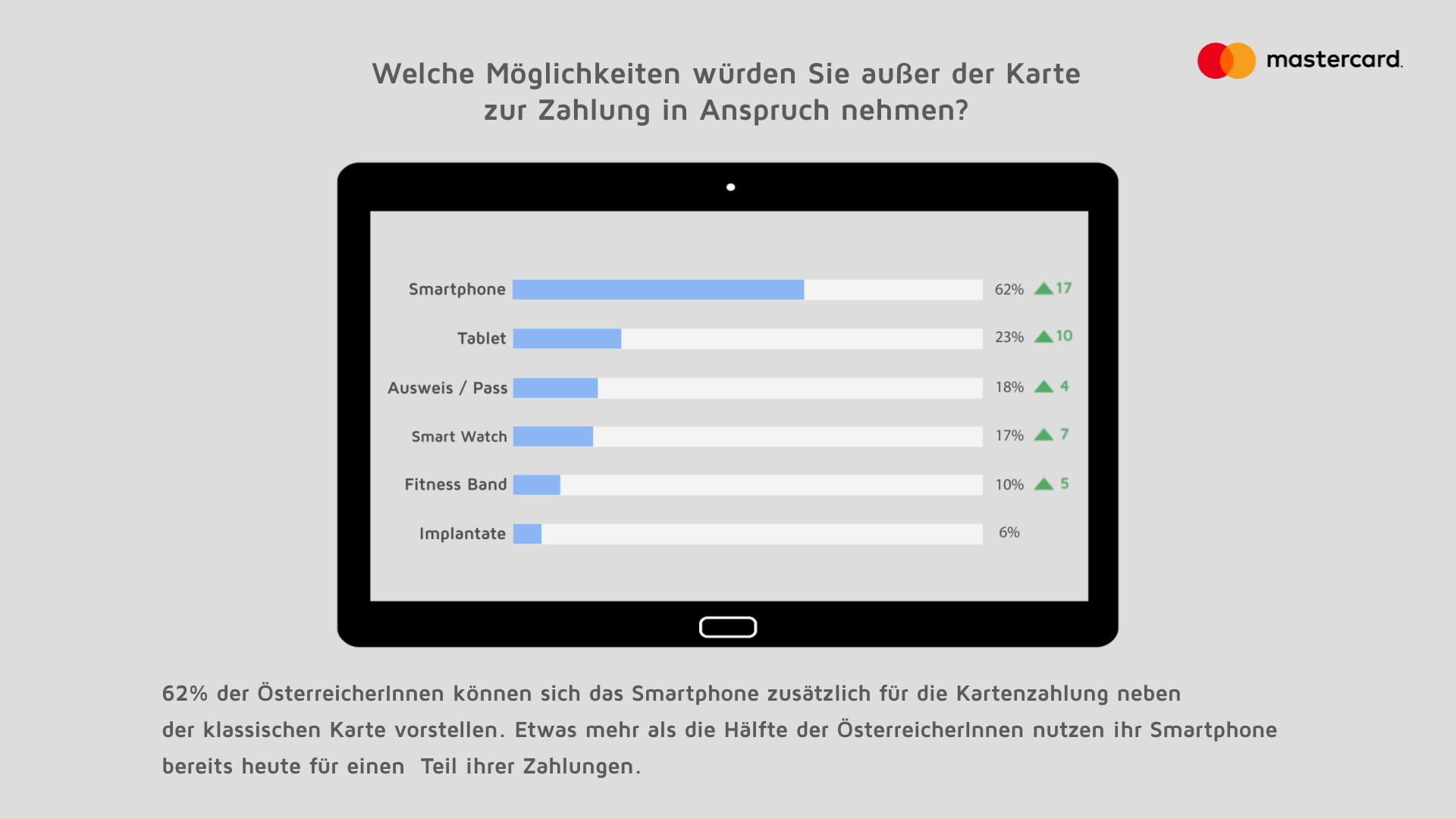 Mastercard hat gemeinsam mit dem Marktforschungsinstitut Ipsos eine neue Studie veröffentlicht, die eindrucksvoll die zunehmende Nutzung von mobilen Geräten für Zahlungsabwicklungen zeigt. Die repräsentative Online-Umfrage wurde im Mai 2019 in insgesamt 13 Ländern der Region Central Eastern Europe durchgeführt und liefert auch für Österreich spannende Ergebnisse: 62 % der ÖsterreicherInnen können sich das Smartphone für die Kartenzahlung zusätzlich zur klassischen Karte vorstellen. Dahinter folgen das Tablet (23 %), der Personalausweis/ Pass (18 %) und Wearables wie Smart-Uhren (17 %) oder Fitness-Armbänder (10 %). „Die Zahlen belegen eindeutig: Österreich ist am Weg zum mobilen Bezahlen. Wir werden in den nächsten Jahren einen rasanten Anstieg der Nutzung sehen“, ist sich Christian Rau, Country Manager Mastercard Austria, sicher und erklärt weiter: „Wir setzen alles daran, den Kundinnen und Kunden den Bezahlvorgang zu erleichtern. Sicherheit bleibt oberstes Prinzip! Darum ist es auch wichtig zu betonen, dass eine Zahlung mit dem Smartphone immer noch eine Mastercard-Zahlung ist.“