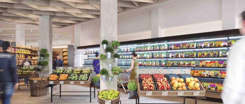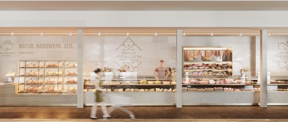 Inspiriert von einem traditionellen Marktplatz wird Obst und Gemüse wie auf Marktständen in aller Frische präsentiert, Bio-Ware bekommt einen eigenen Auftritt in der „Biothek“. Lokale Spezialitäten wie das Fleisch von der Metzgerei Zöggeler oder Fisch und Meeresfrüchte von Melega & Prini haben ihren besonderen Platz.