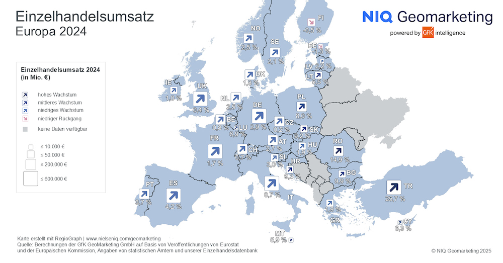 Im Jahr 2024 verlangsamte sich das Wachstum des Einzelhandelsumsatzes in der Europäischen Union deutlich im Vergleich zum Vorjahr. Während 2023 noch ein deutlicher Anstieg von 5,5 Prozent verzeichnet wurde, lag das Wachstum 2024 nur noch bei moderaten 3,0 Prozent. Die höchsten Zuwächse wurden in osteuropäischen Ländern erzielt, allen voran in Rumänien mit 14,9 Prozent, gefolgt von Bulgarien (+9,9 Prozent), Kroatien (+9,3 Prozent) und der Slowakei (+9,2 Prozent). In Estland hingegen ging der Einzelhandelsumsatz um 1,3 Prozent zurück – bedingt durch politische Unsicherheiten und eine zunehmende Konsumzurückhaltung.