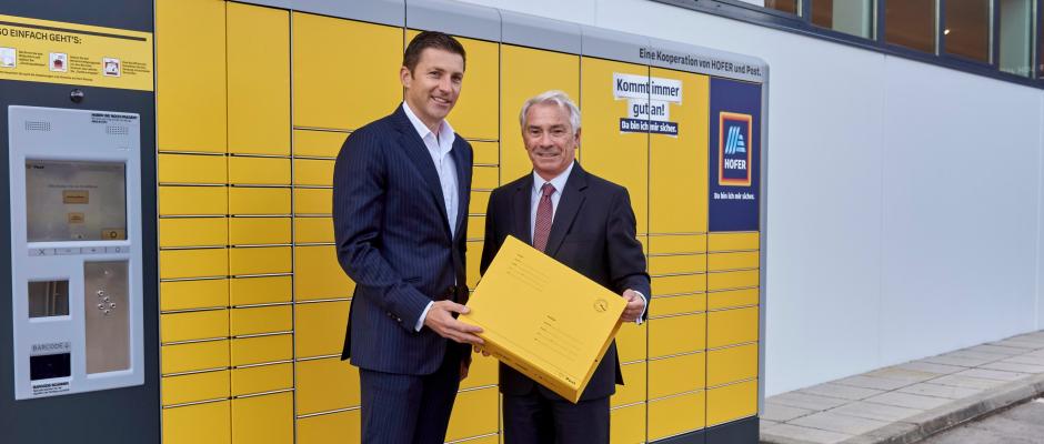 „Wird das vorerst als Pilotbetrieb gestartete Projekt gut angenommen, soll das Service österreichweit ausgerollt werden“, so DI Dr. Georg Pölzl, Generaldirektor der Österreichischen Post AG, und Dr. Günther Helm, Generaldirektor der Hofer KG, bei der gemeinsamen Inbetriebnahme der ersten Post-Station bei der Hofer-Filiale in der Linzer Straße 455, 1140 Wien.