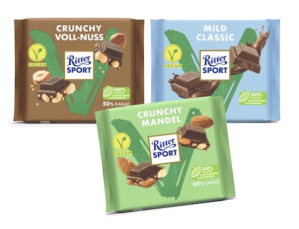 Ein kleines Update gibt es bei den drei bestehenden veganen Ritter Sport Klassikern: Ritter Sport Crunchy Mandel begeistert mit 50% Kakaoanteil und ist die beliebteste vegane Schokolade in Österreich*. Bei der Sorte Crunchy Voll-Nuss (ebenfalls mit 50% Kakao) sorgen neben ganzen Haselnüssen auch knusprige Quinoa- bzw. Amaranthcrisps für den besonderen Crunch. Und Ritter Sport Mild Classic steht dank Mandelmehl und Haselnusspaste herkömmlichen Milchschokoladen geschmacklich in nichts nach.