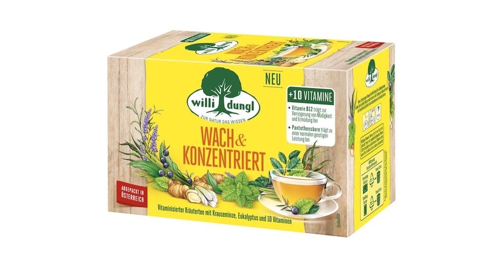 willi dungl Wach & Konzentriert ist ein Wohlfühl-Kräutertee, der mit hochwertigen Zutaten und einem Mix aus 10 Vitaminen zu einem klaren und wachen Geist beiträgt. Krauseminze, Zitronengras und Eukalyptus sorgen dabei für den erfrischenden Geschmack. Das belebende Gefühl entsteht durch eine feine Mischung aus Mate, Ingwer, Wacholderbeeren und Lavendel.