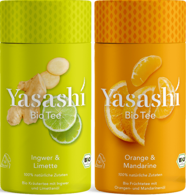 Basierend auf 100 % biologischen Zutaten, setzen die Yasashi Bio Tees auf wenige, besonders hochwertige Inhaltsstoffe sowie wertvolle Frucht- oder Gewürzöle und garantieren damit besten Geschmack. Auch bei der Verpackung setzt die neue Premium-Marke auf die Kraft der Natur: Yasashi kommt in hochwertigen, bunten Dosen aus vollständig recyclebarem, FSC-zertifiziertem Karton und setzt somit ein Zeichen gegen Plastik. Auch die Teebeutel bestehen aus nachhaltigem, naturbelassenem Material (ohne Metallklammer).